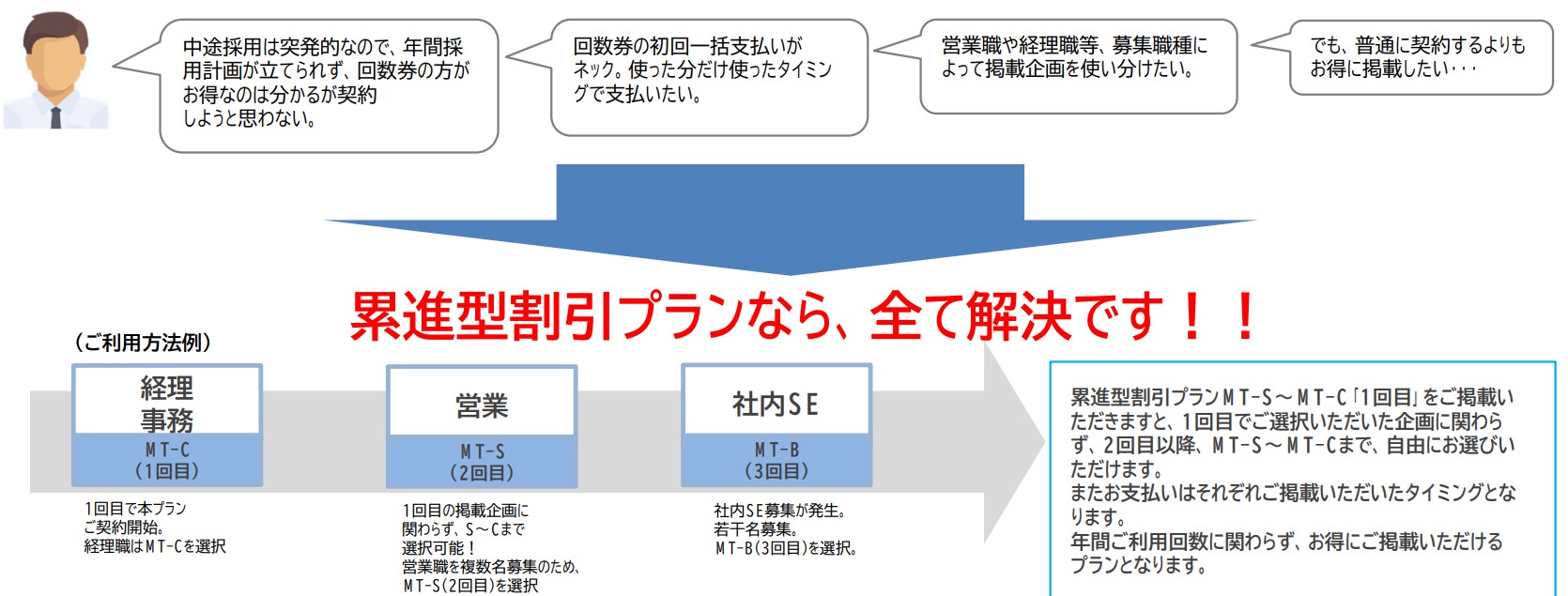 累進型割引プランとは、ご掲載いただく回数に応じてマイナビ転職基本企画(MT-S~MT-C)の割引率が変動する(割引率があがる)商品です。 年間回数に下限・上限はなく、基本企画以外のナビオプションとも自由に組合せが可能です。 ■お申込み・ご掲載にあたっての注意事項 ご利用にあたっては、「〇回目」の順番通りにご掲載をいただく必要がございます。 MT-〇1回目の次にMT-〇3回目や、MT-〇2回目の次に1回目といった、順番を逸脱したご掲載は不可となっております。 前回のお申込み分のご掲載が開始するまでは、次のご契約は出来ません。 また、複数職種の同時お申込み・ご掲載も不可となります。ご掲載開始日が重ならないようにご利用ください。 ■「累進型割引プラン」の有効期限について 「1回目」のご掲載開始時点で、本プランの有効期限が決定します。 例えば10月1日に1回目のご掲載を開始いただいた場合、翌年9月末日ご掲載開始までが、本プラン「2回目」以降のご掲載権利付与期間となります。 翌年10月1日以降に改めてご利用いただく場合は、「1回目」よりご利用いただく事になります。 ※有効期限の延長は出来ません。 ■グループ企業の利用について 2回目以降のご掲載権利は、1回目をご利用いただいた企業様・窓口に限ります。 グループ会社と共通で回数を消化する事は出来ません。 ■他商品との組合せについて 他サービスについては、都度ご契約をいただく形となります。他キャンペーンとの併用も可能です。※まとめてお申込みを いただくことは出来ません。 ■ご請求について ご掲載開始月に、ご掲載分のみご請求させていただきます。 回数をまとめたご契約や、ご掲載いただいていない分の一括ご請求には対応出来ません。 また、1回あたりのご請求に関して分割は出来ません。 ■サービス内容の詳細・規約等について サービス内容の詳細については、本注意事項に加えて、マイナビ転職「総合企画書」「企業規約」に記載の事項に従ってご利用いただくものとします。これらを必ずご確認・同意の上、お申込みください。 企画内容・料金を都合により変更させていただく場合がございます。 本企画書の料金は、消費税抜きの金額です。消費税は、サービス提供時点の消費税率を適用の上、ご請求時に別枠表示(円未満切り捨て)し、合計額をご請求させていただきます。