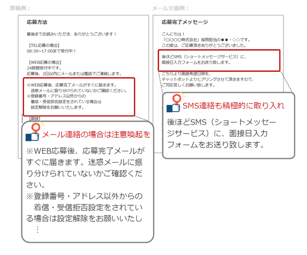 来社のために準備していることが応募者とのやりとりで伝わると他社との差別化&来社率UPに。
