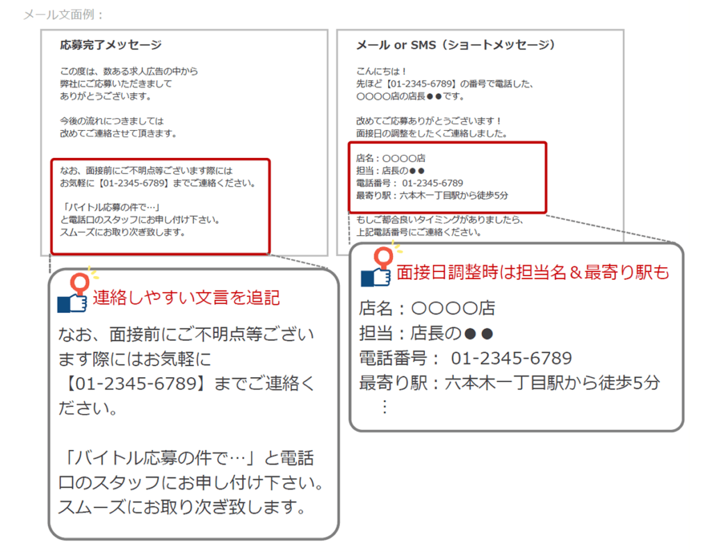 気になることや面接前に確認したいことがあっても連絡手段が分かりづらいと、連絡できないまま、面接当日まで不安が残ってしまいます。やりとりしているメールや電話でちゃんと伝えましょう。