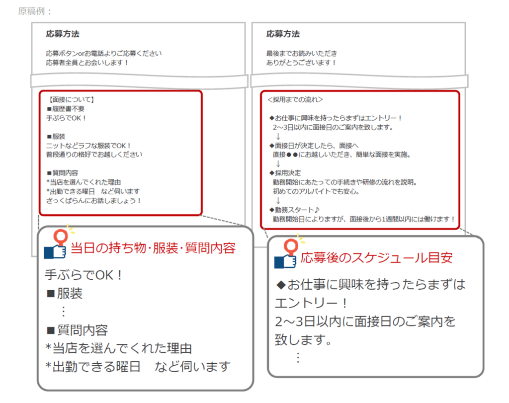 はじめてバイトする学生や面接回数が少ない方にとって、事前に質問内容や応募後のフロー、面接対応者などが確認できると、面接へのハードルが下がります。