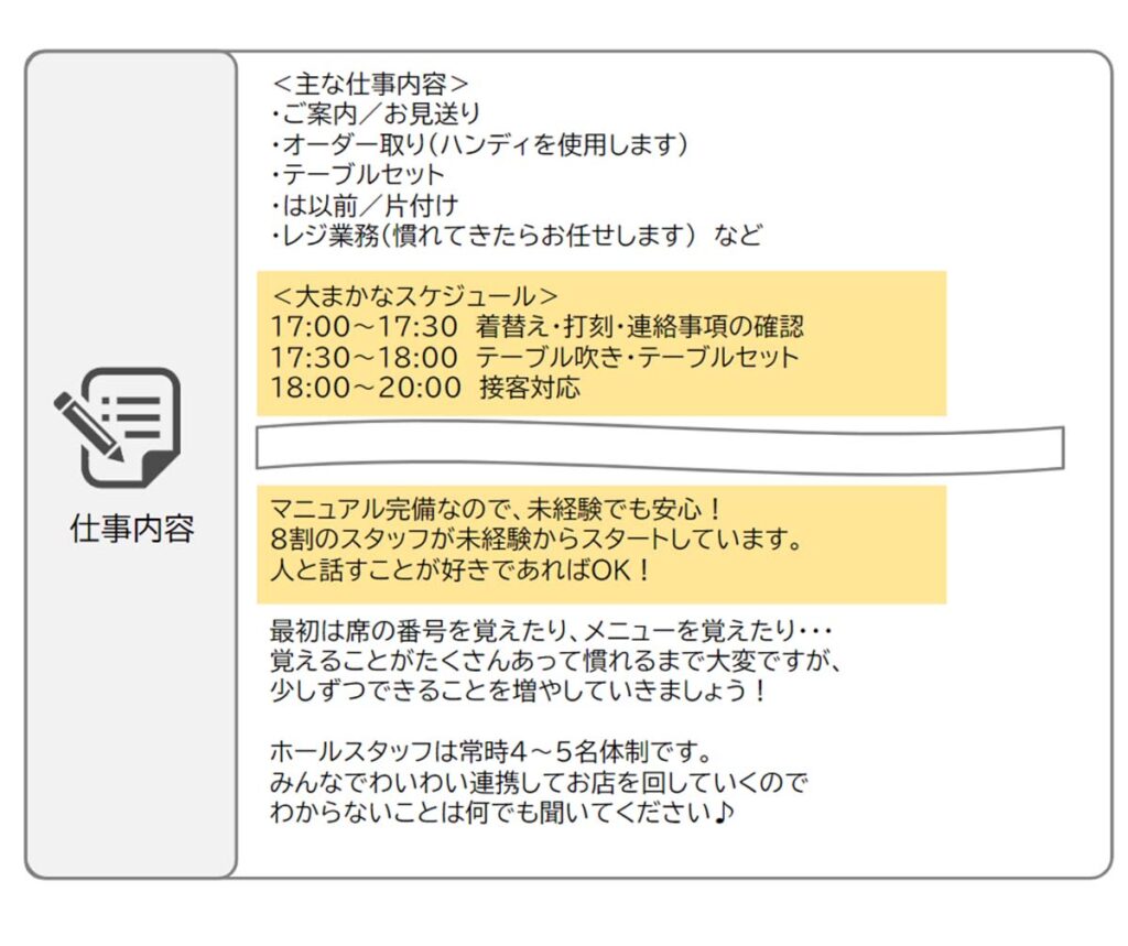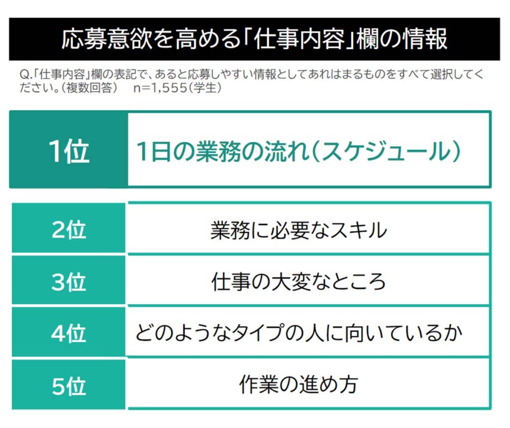 応募意向を高めるためには、「1日の業務の流れ」「業務に必要なスキル」「作業の進め方」など働く際にする業務をイメージしやすい内容を記載することが大切です。
