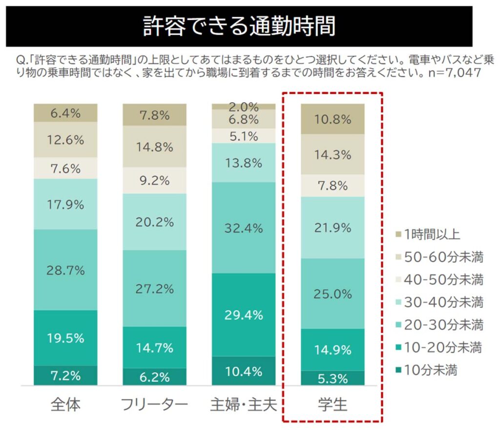 「徒歩・自転車で通える」「駅から近い」「乗り換えが少ない」という項目が重要視されており、学生は、約7割が40分未満までを許容範囲と考え、アルバイト先を選んでいます。