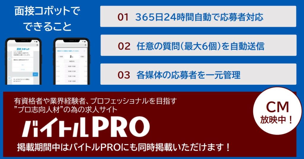 | Bプラン &バイトルPRO 10枠 | エリアリスティング 5枠 | 面接コボット |