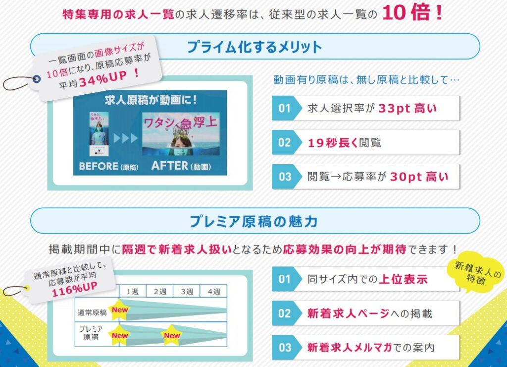 | プライム付 プレミアEタイプ | 4週間 | 190万円 | 88万円 | 85万円 | 最長8週間掲載 ※ | 600通×2本 | 1800通 |