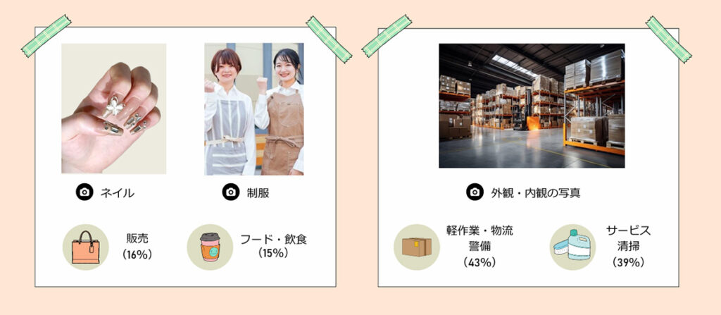職種別にみると、販売・フード・飲食では「制服やネイルなど服装の写真」が、軽作業・物流・警備・サービス・清掃では「外観・内観の写真」が応募意欲を高めました。