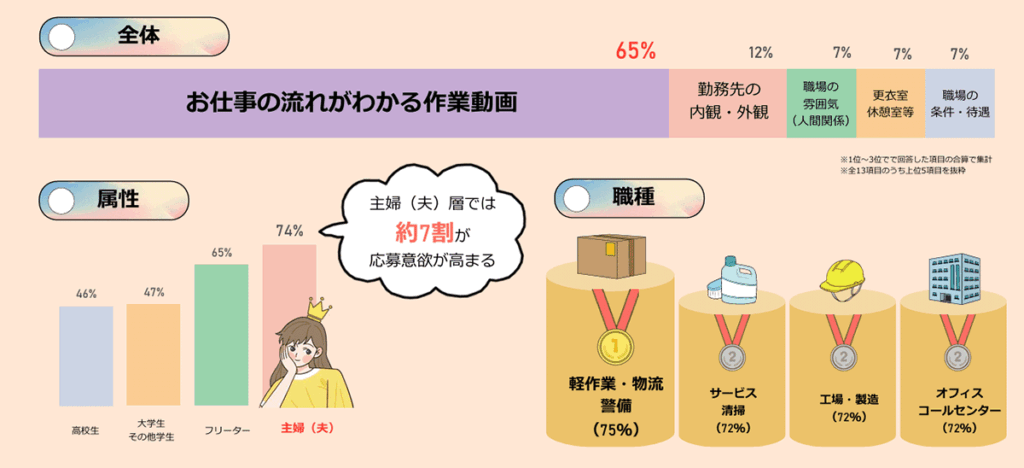 「お仕事の流れがわかる作業動画」があると、過半数の人が応募意欲が高まると回答。
