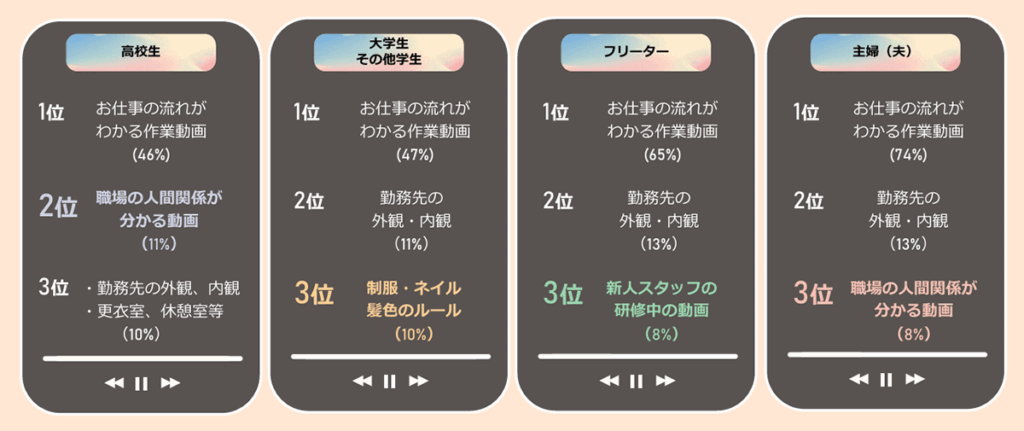属性別でみると応募意欲が高まる動画内容に差が出る結果となりました。