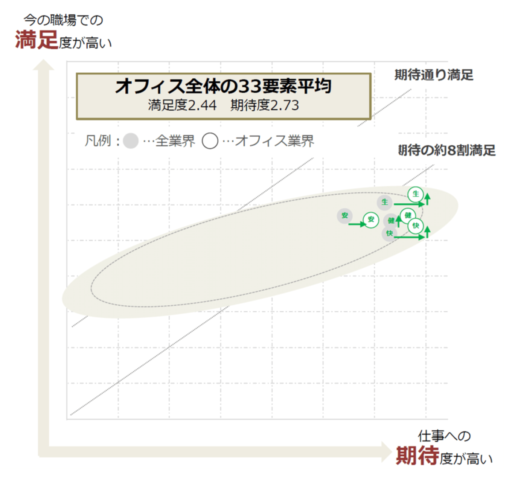 働く幸せの33要素を「仕事への期待度」と「今の職場での満足度」でプロットしたエリアを楕円で表現。各分析結果は、この楕円で示されたプロットエリアと、33要素の平均を表示しています。