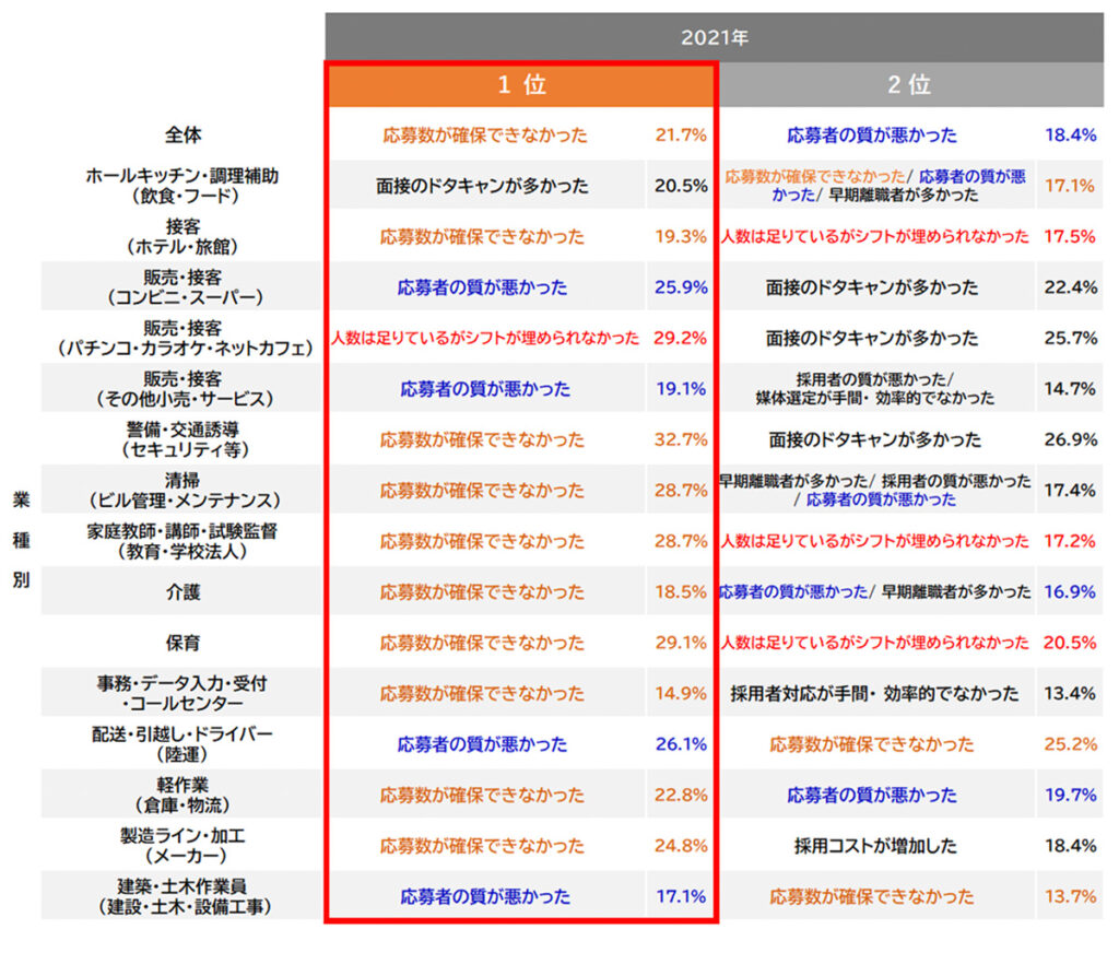 アルバイト採用現場での課題(職種別)