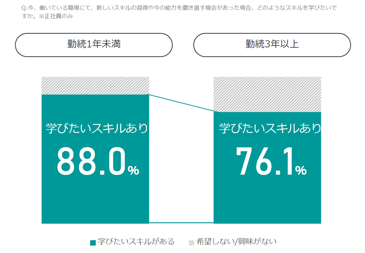 特に勤続1年未満 がリスキリングへの 取 り 組 みに 対 しての 希望 ・興味が 88.0% と高い。