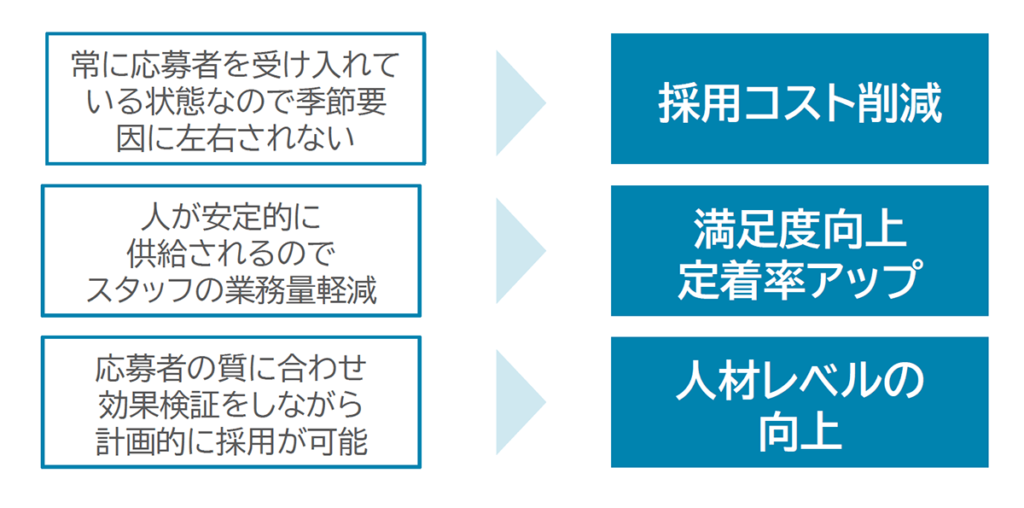 一度の募集で多くの応募を集める事が難しい為、常時掲載で一件当たりの 求人費を 削減し、データ 分析によって効果改善を常に行うことでコストを抑えながら採用成功へとつなげます。