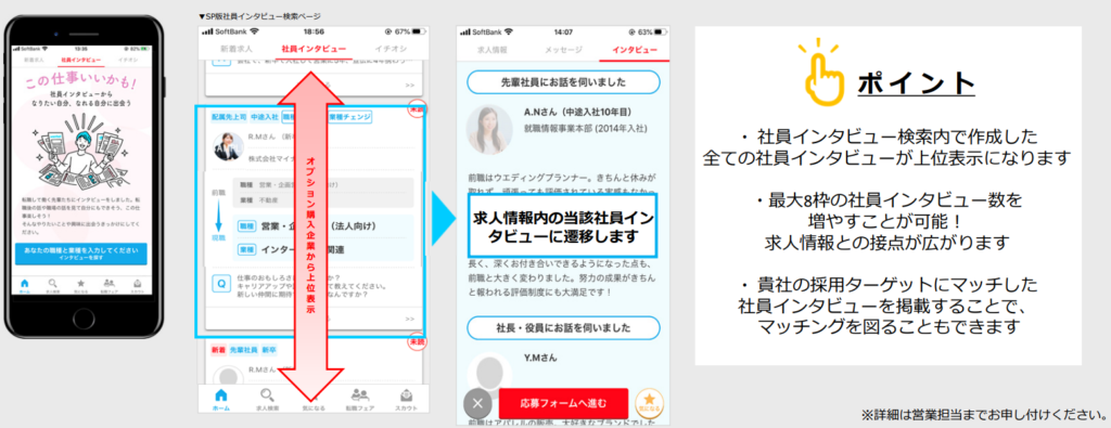 転職希望者の注目度が高い「社員インタビュー」検索ページ内で上位表示され、インタビュー枠が増枠になります!