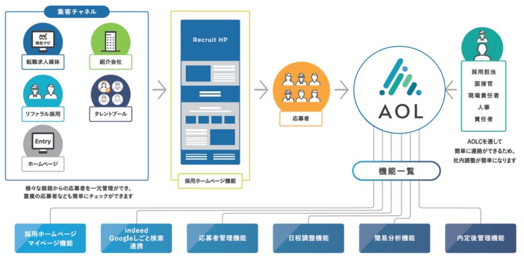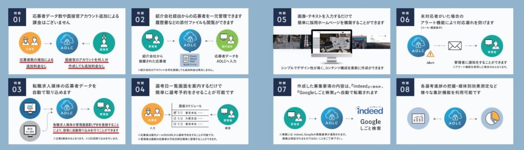 採用管理システム「アクセスオンライン キャリア(AOLC)」は、中途採用業務に必要な機能が全て揃ったパッケージサービスです。