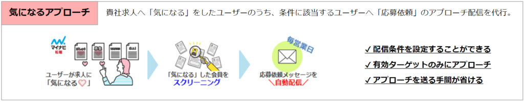 ※「応募」「セミナー応募」「過去掲載時、スカウト辞退・応募依頼辞退」の対象者は除いて配信します。