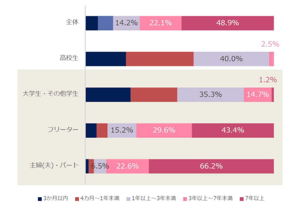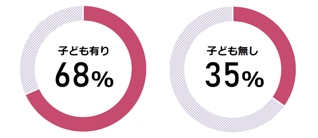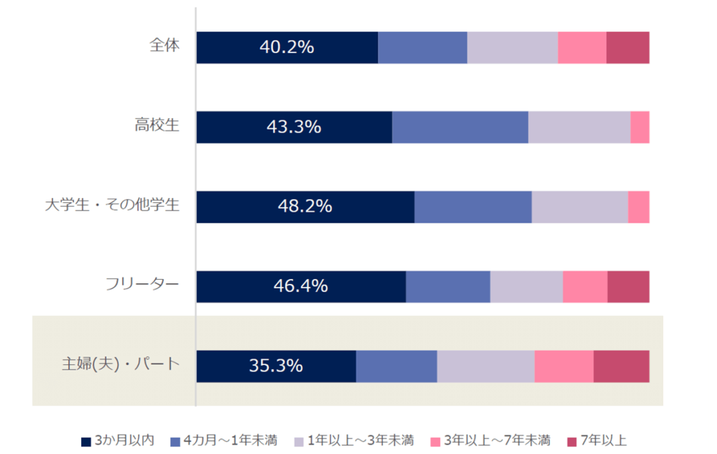 全体の約4割が3か月以内に辞めたことがある一方で、主婦 夫 は短期間で辞めた人が少なく、特に子育て中の方の約7割は7年以上続けています。これは子どもがいない方の約2倍にあたります。