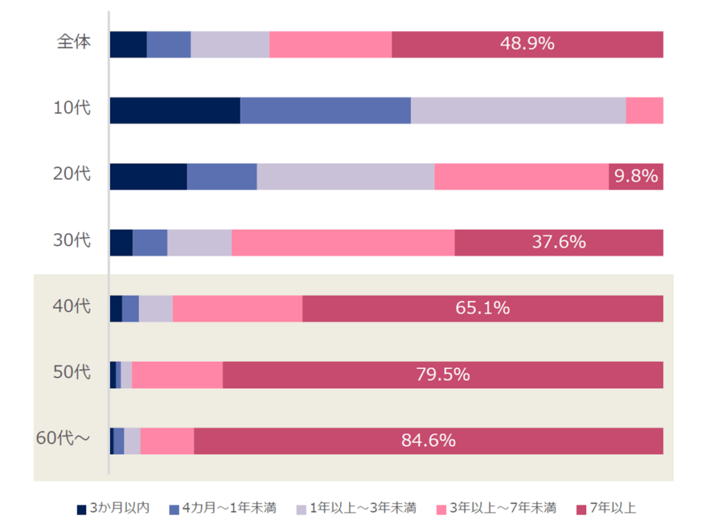 40歳以上の65%以上が7年以上働いた経験があるという結果になりました。シフトが希望通りになることや、やりがいがあることが働きやすい環境を作り、長期間の勤務を促進しています。
