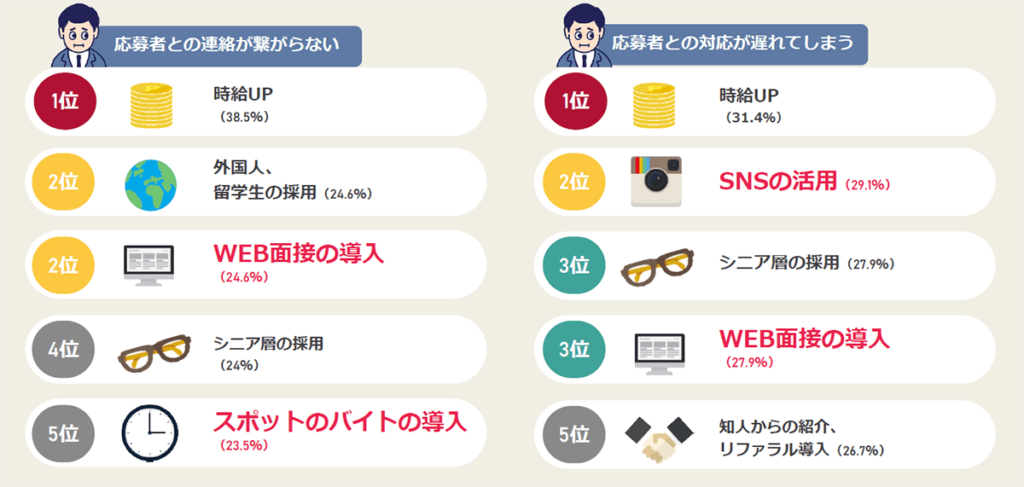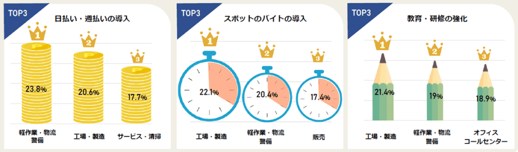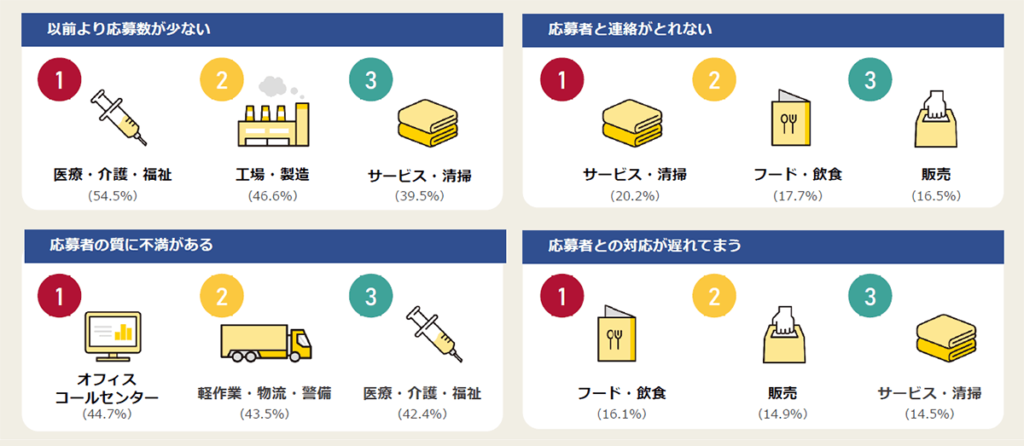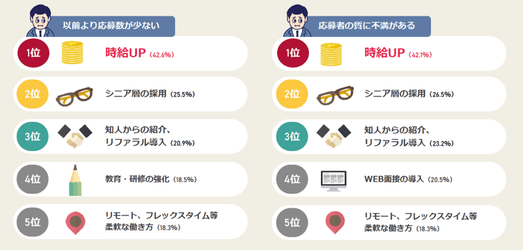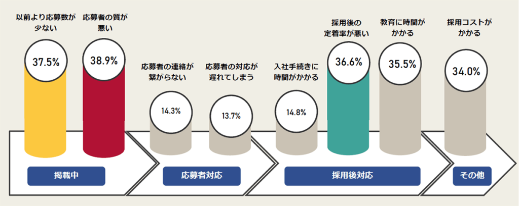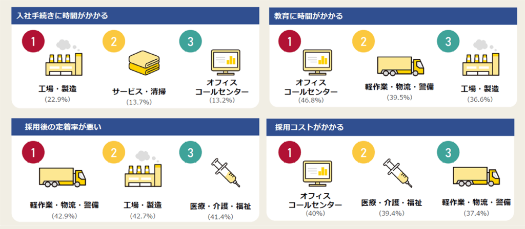現場労働職は定着率、オフィス職種はコスト・教育に課題