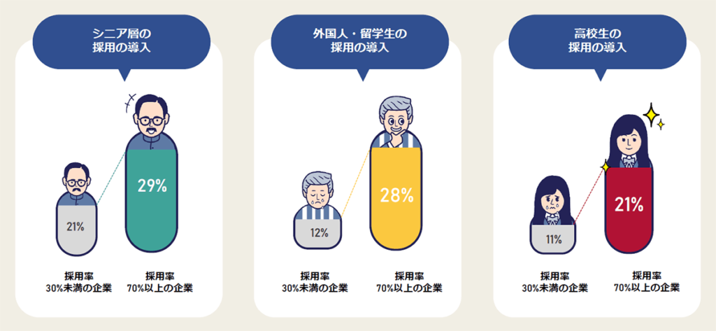 採用率が70%以上の企業は採用率30%未満の企業と比較して、シニア層、外国人・留学生、高校生など採用ターゲット拡大に効果を実感しています。