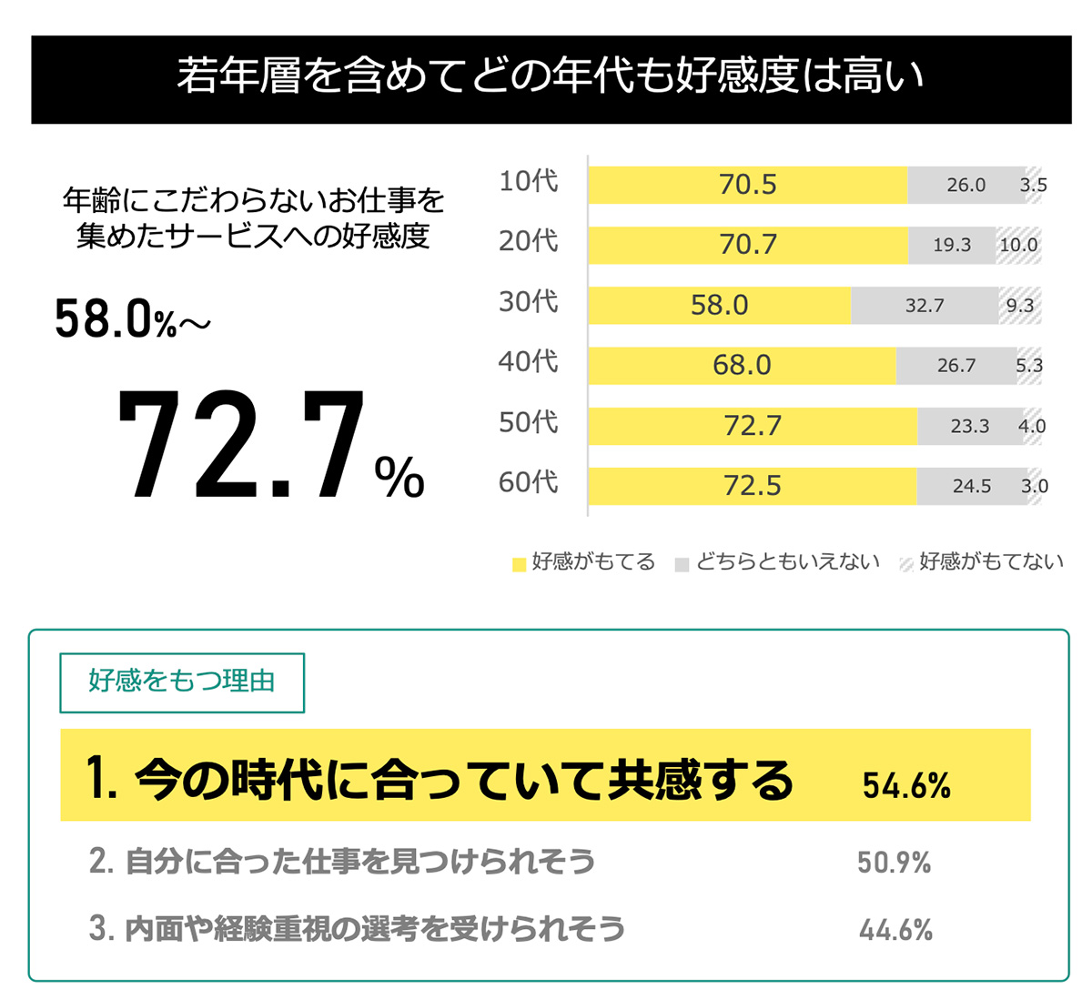 年齢にこだわらないお仕事を集めたサービスへの好感度は各年代で高く、
