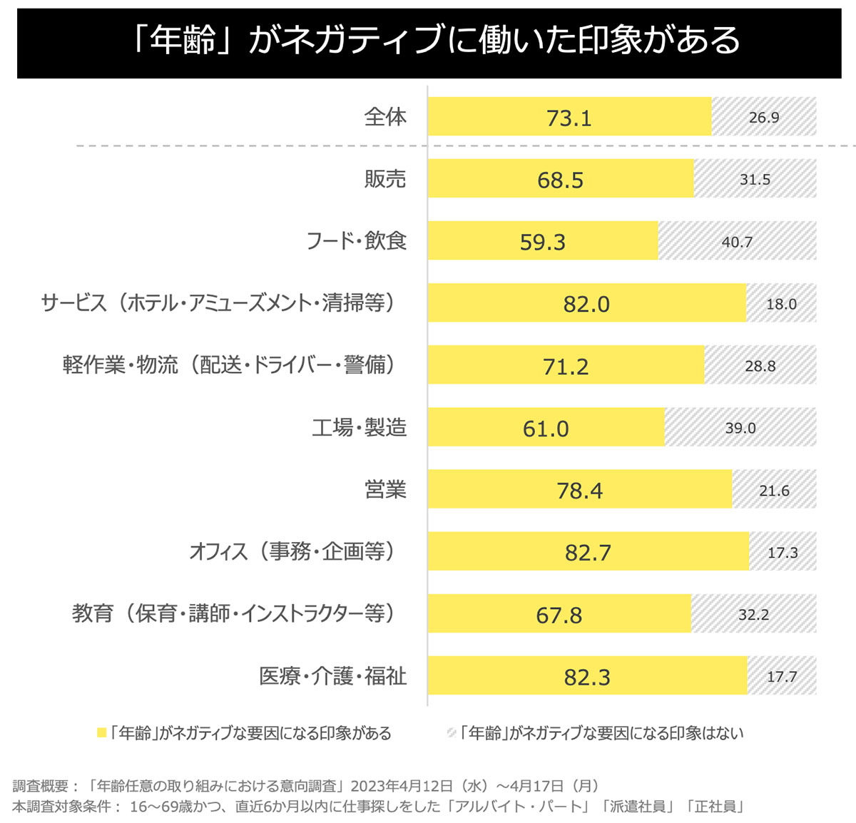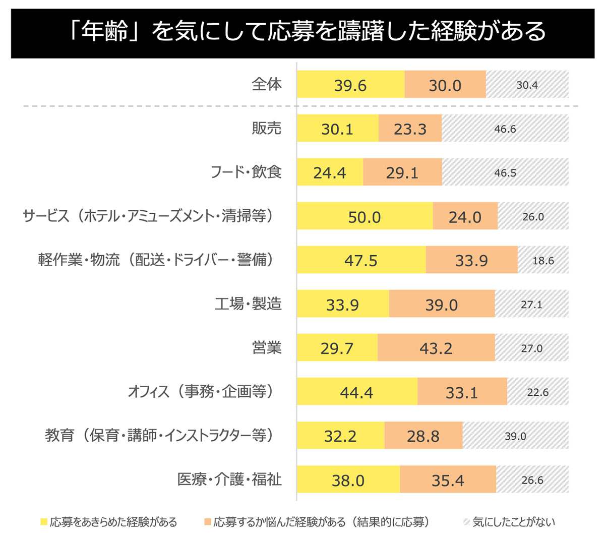 多くの職種の求人で、「年齢」を気にして応募を躊躇した経験があり、特にサービス、営業、 オフィス、医療・介護・福祉は、採用までの間に「年齢」がネガティブに働いた印象があると回答。