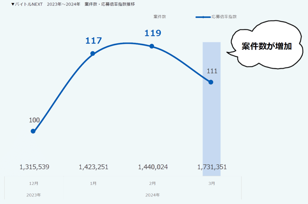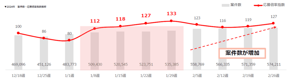 年明けすぐは案件数は少なく、応募効果も高いタイミングです。春に向けて求職者のお仕事が探しが活発化するため、早めの動き出しが応募効果に大きく影響を与えます。