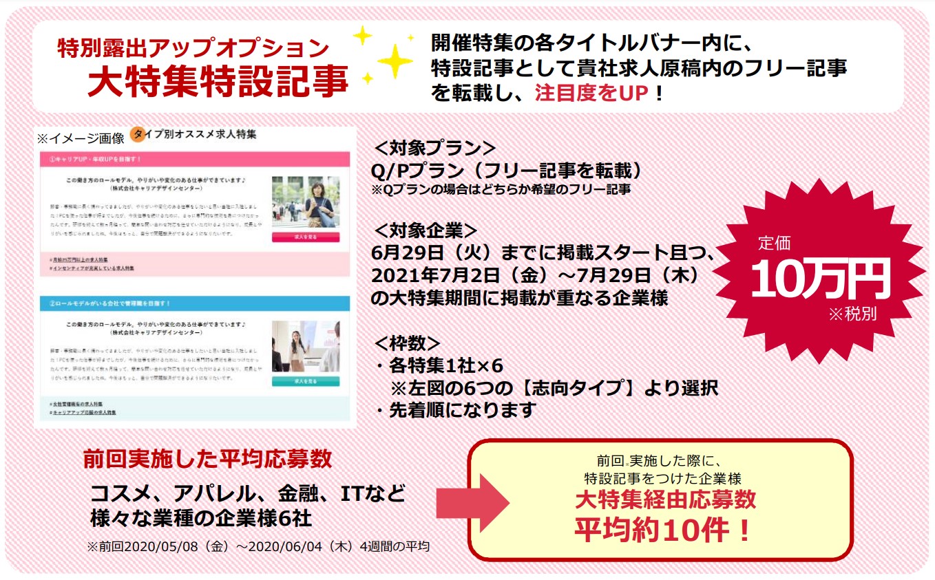 大特集実施時アプローチを強化いたしますので、各職種経験者や希望者の応募増が見込めます。
